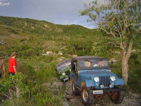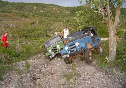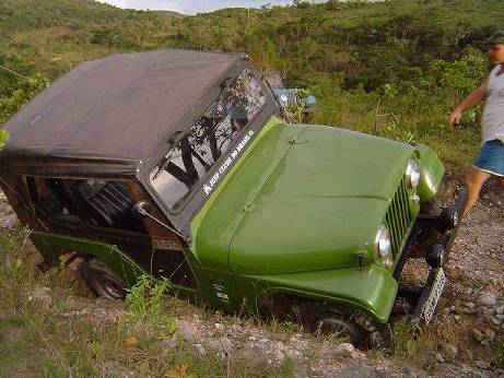 De repente um baque, e barulho de restolho de travessa de carroceria moendo... O Edwaldo adernado uns 45º prá direita. Liga-se tração, 2ª reduzida, e X na tração do bicho. Então vamos de ré e 1ª reduzida, prá balangar o Jeep e ver se sai. Que nada ! O X na tração tava lá. Ainda mais que os quatro Congas lisos, que o Edwaldo estava calçando, não estavam ajudando.
