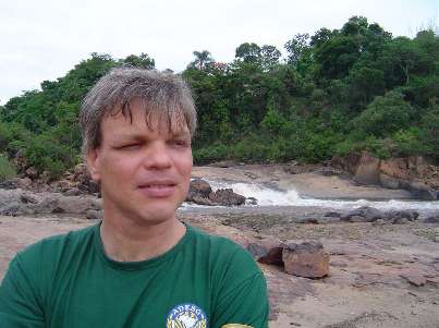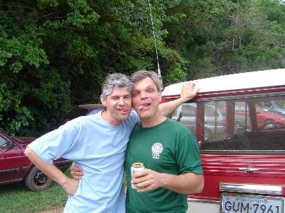 Achamos uma pousada bacana, num lugar bacana... Legal, estamos arrumados, e tem até um Jeep branco por aqui. Não fosse a gritaria de um tanto de menino na piscina, somada à um tanto de bêbado no boteco da pousada, até tínhamos ficado. "Vão embora procurar outro pouso!". E foi só funcionar os Jeep's, que me sai uma loura doida de dentro do boteco gritando: "Peraí, companheiros! Vamos conversar!" E a tal loura doida agarra a gente de conversa, sem parar de falar um instante. "Prazer! Sou a Eliane, dona do Jeep branco", e patatí-patatá, e num parava de falar... E eu doido prá ir logo achar outro pouso, e o Gutty doido prá voltar para casa. Dada a conversa por encerrada, já saindo com os carros, a Rose me vira prá loura doida e pergunta: "Aquele ali na mesa é que é seu marido? Conheço ele, é cliente da loja!" Pronto! A loura doida me chama o marido, o Ímolo, que estava mais tonto que uma égua, de tanto beber juntamente com um caipira nativo e um peruano perdido na Serra da Moeda. Eu já tinha passado próximo a mesa deles, escutado uma parte da conversa. Conversa de tonto, cheia de papo cabeça... Ser casado com mulher que trabalha no varejo tem disso. Conhece todo mundo, em qualquer lugar que se vá. Melhor se candidatasse a vereador... E me veio o caboclo, agarrou mais na conversa, e nesse meio descobrimos que moravam próximo à minha fábrica, que tinham outra que fazia insumos de escritório que a Rose comprava, e o falatório não parava. "Ô gente, deixa nóis ir embora prá procurar um pouso", falei a eles. Foi nessa hora que o Ímolo e a Eliane retrucaram: "Não! Vocês vão ficar lá em casa, no nosso sítio. Mas antes vamos passear numa cachoeira aqui em cima." E também não deixaram o Gutty ir, obrigando eles a irem à cachoeira também. Fecharam a conta, subiram no Jeep branco, que depois fiquei sabendo que se chamava Suspiro, e foram na frente ensinando o caminho. Rodamos uns 5 Km, e o Ímolo manobra o Suspiro de volta, me caindo numa vala no canto da estrada, de tão tonto que estava. Tive eu que ligar as rodas livres do Jeep, manuais, e uma dentro do buraco! O recurso foi mergulhar por cima do capô para ligar a que estava lá no fundo. O Ímolo tentou, e não conseguiu. O Suspiro estava agarrado. Vem o Gutty com uma corda de uns 30 metros, mas me para a 3 metros do Suspiro. "Dá mais distância ai, Gutty. O pião tá tonto, e num demora bate no seu Jeep quando o dele sair do buraco". "Então deixa eu tomar a direção do Ímolo, prá sair mais rápido, e não amassar seu Jeep, mula manca!" Tiramos o Jeep da vala, e continuamos seguindo procurando a tal cachoeira. Num é que o Ímolo me volta para o mesmo boteco onde estávamos? Parou uns 50 metros à frente, apeou e disse: "É aqui!". Era um sítio abandonado, com um corguinho e uma bica caindo água. Abusei um lugar mais difícil para uma fotografia, e a Rose me seguiu, desobedecendo nas minhas orientações de como passar no lugar. O resultado é que tomou um tombo de bunda, dentro da lama do corguinho. Tudo fotografado pela Lili do Gutty.