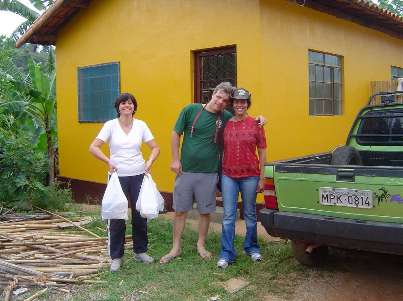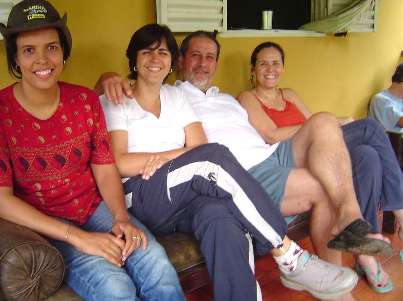 Já na volta, passando novamente por Moeda Velha, tivemos que passar pelo Côco, distrito de Moeda, e na porta do sítio de quem? Do Ímolo e da Eliane, a louca. Já tinha um bom tempo que não viamos eles. Depois da primeira viagem tinha encontrado com eles por perto da fábrica, e a Rose tinha os visto quando foram comprar coisas na loja. A entrada do sítio estava um pouco diferente, pois tinham tirado a porteirinha e colocado um portão eletrônico com interfone. Já viram sítio com esses treim? Pois é, lá agora é assim. Toquei o interfone, e veio a Eliane, a louca, atender. Notei que era ela, e resolvi fazer hora, amolando ela um pouco. "Ô dona! Eu sou o Zé Leotério, lá do Côco, e tô aqui porque o Sô Ímo mandou eu vir fazer os cascos da égua." "Mas num tem égua nenhuma aqui!", respondeu ela assustada. "E mula? Num tem não? Vim fazer foi os cascos da mula". "Não!", respondeu ela ainda mais assustada. "E eu tô falando com quem então? Num é com a mula do Sô Ímo? Abre essa porqueira de porteira ai, porque nóis tão querendo entrar prá beber café". Ai que ela reconheceu minha voz. Ficamos um bom tempo conversando, esprachados e escornados pela varanda à fora. Até o Chico se estatelou... Depois de um cafezão cheio de quitandas, voltamos para Belorizonte.